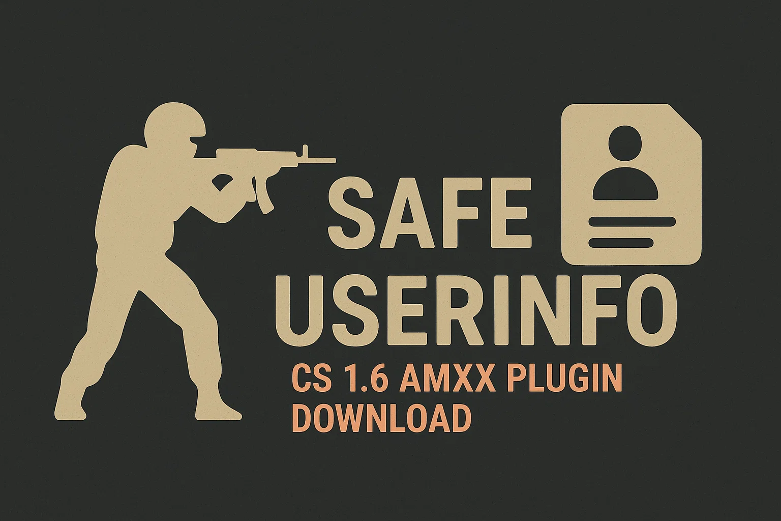 image for the “Safe Userinfo” plugin. The image has a dark gray background. On the left, there is a tan silhouette of a Counter-Strike player aiming a rifle. To the right of the silhouette, large, bold text reads “SAFE USERINFO”. Above the text is a user icon, also in tan. Below the main text, in a light orange color, it says “CS 1.6 AMXX PLUGIN DOWNLOAD”.